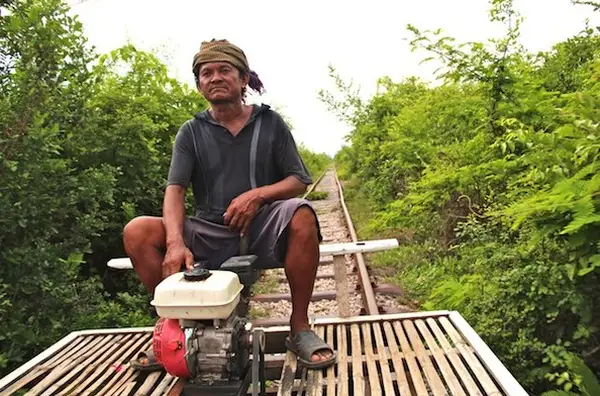 El tren de bambú, que es una pista de siete kilómetros entre las aldeas, muestra carruajes que son una cama plana de bambú sobre ruedas y están ejecutados por motores de motores o tractores. Los trenes se balancean a través del desierto camboyano, alcanzando velocidades de hasta 25 mph, pasando por exuberantes campos y la vida silvestre que lo acompaña. Sobre puentes desvencijados y otros paisajes intactos. Con la línea del tren solo siendo la pista singular, es mejor esperar que el tren que está montando no se encuentre con otro proveniente de la otra dirección. Si bien es seguro, es una regla no escrita que el grupo con la menor cantidad de pasajeros debe descarrilar y dejar que el grupo más grande pase.