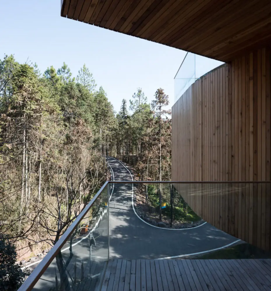 El edificio revestido de madera construido por la Oficina de Arquitectura de Shanghai Bengo Studio, que ofrece vistas de 360 grados de la belleza circundante, se sienta en medio de su ubicación de 120 metros cuadrados y se compone de dos habitaciones, dos baños y una sala de estar, todo lo que rodea una escalera de espiral central.