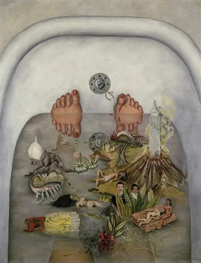 En las imágenes seleccionadas recopiladas a continuación, la gama completa de su estilo e imaginación se destaca. En pinturas como Que agua me dio , su verdadero surrealismo de ensueño está en plena vigencia mientras inventa la fantasía, la fábula y los sombras oscuras de la realidad del lienzo escapista del agua del baño. Otras pinturas como El sueño (la cama) Refleja su intrépido reconocimiento de su propia salud enfermo, como escribió en sus últimos días por encima de un boceto del ángel negro de la muerte: espero con alegría la salida, y espero nunca volver, Frida. Mientras que trabajos como Autorretrato (el tiempo vuela) Demuestre que también tenía un ojo irónico sobre la realidad que encontró que con demasiada frecuencia era retratada en la superficie 2D de JeJune, mientras caminaba en las profundidades caleidoscópicas que acechaban debajo.