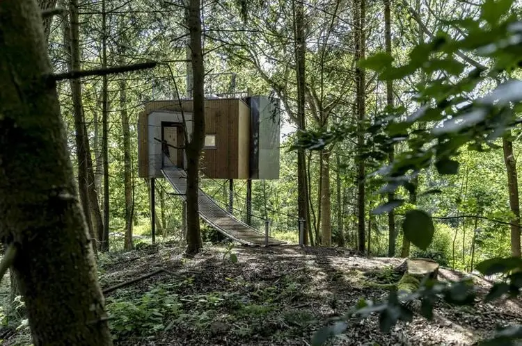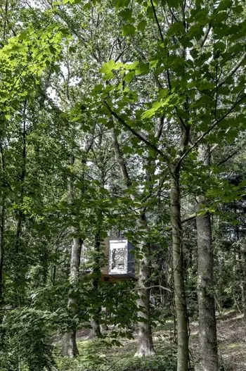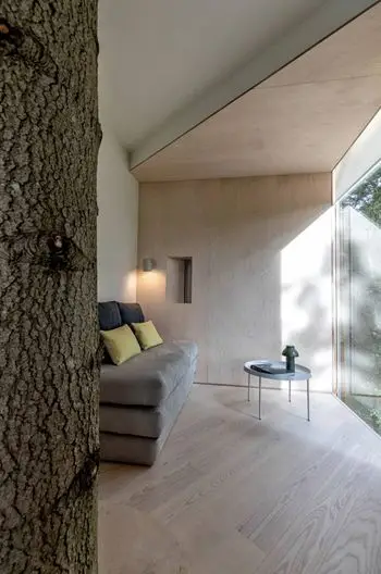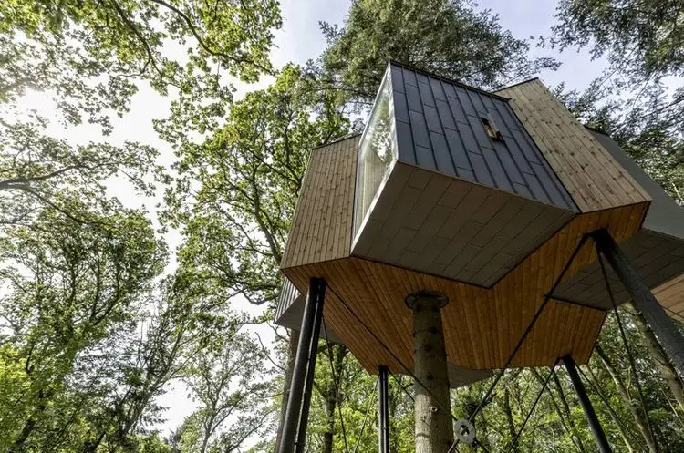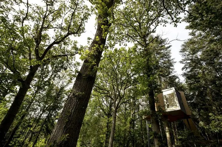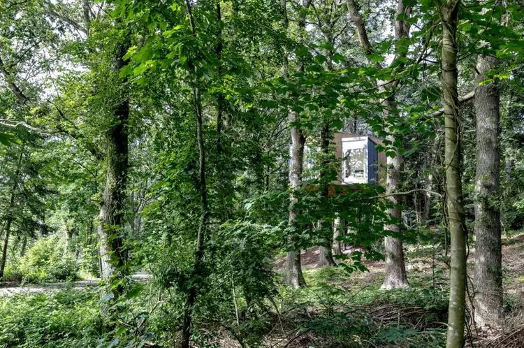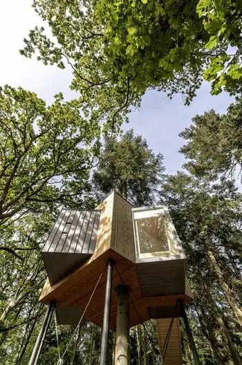 Con ciervos salvajes que se liberan en el bosque, la cabaña se encuentra en un pino y se posa en una pequeña ladera conocida como el montículo del enano. Las cabañas se encuentran en una pequeña colina con vistas a un prado que ofrece una vista maravillosa sobre la parte superior del bosque y deja entrar el sol durante la tarde, dijo el estudio de arquitectura. Estos . El acceso a la terraza del techo da la impresión de que continúa subiendo al árbol para llegar al dosel.