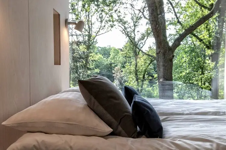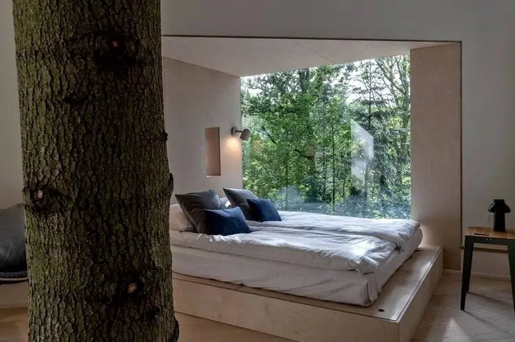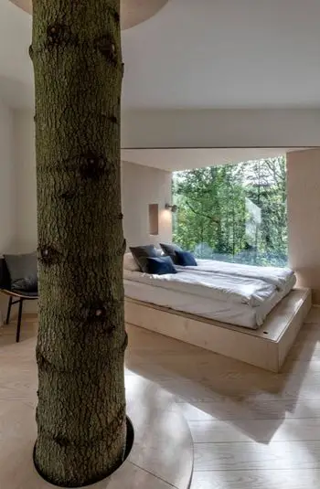 La primera casa del árbol completada es una de las nueve que decorará el área. En el interior, la cabina es moderna, cómoda y Hyggelig, explica el hotel. Construido a seis metros en el árbol, la cabina encierra el árbol en sí que sube por el medio de la cabina, asegurando que nuestros invitados estén realmente cerca de la naturaleza. Grandes ventanas hacia el sur y el oeste dejan mucha luz natural.