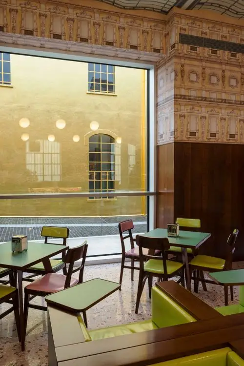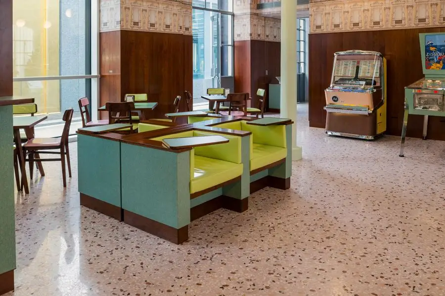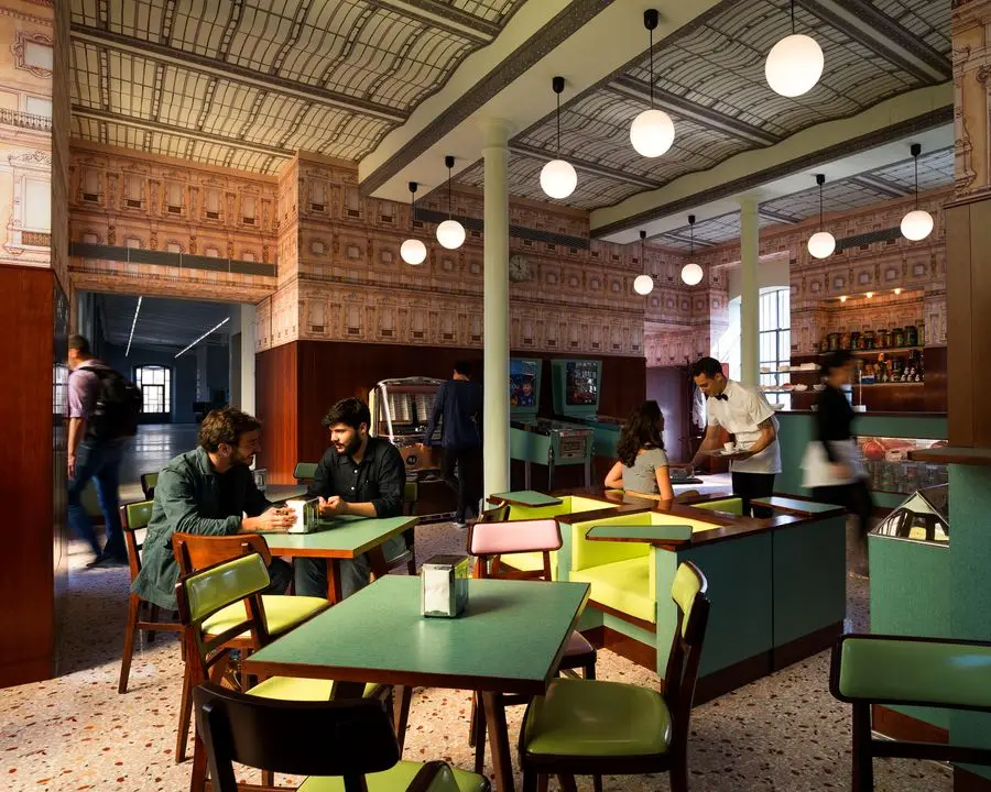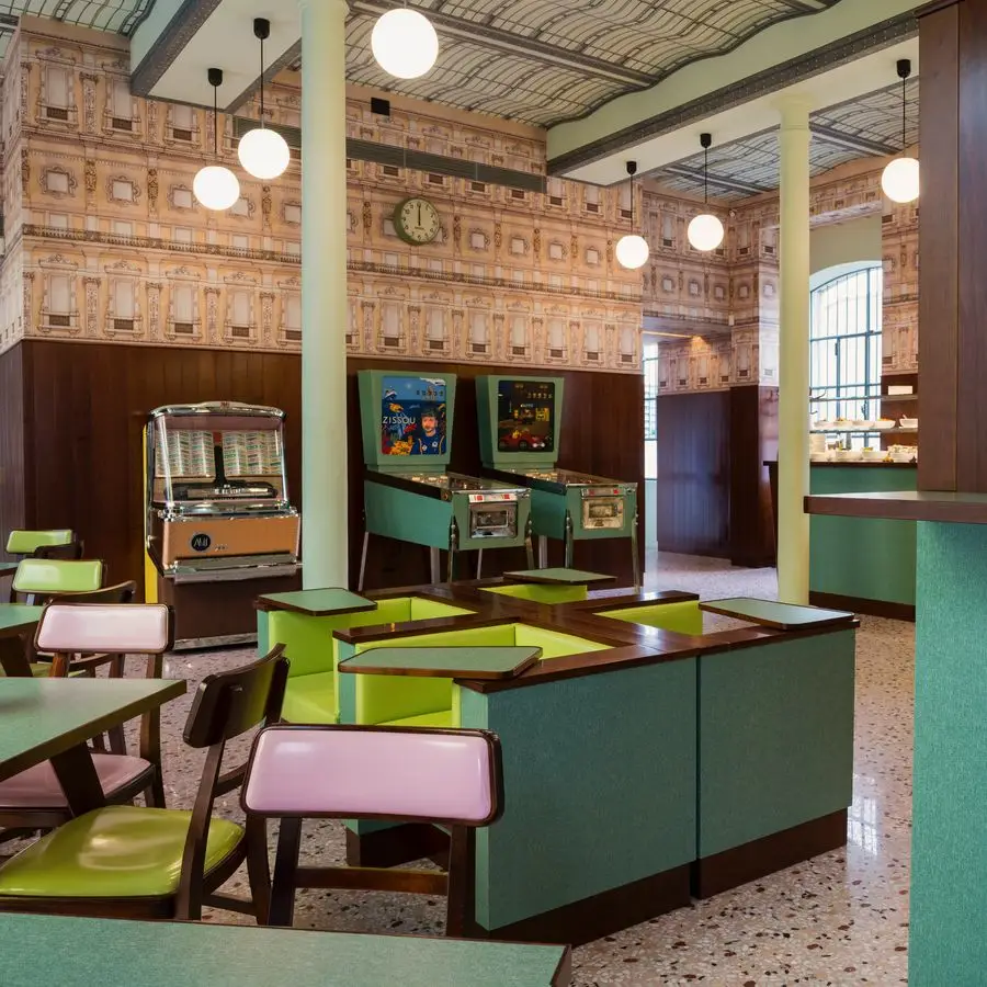 El café se inspira en la cultura pop italiana y la estética de un prominente movimiento artístico de los años cincuenta y sesenta. Ubicado en el edificio de entrada de Fondazione Prada, el café ha hecho referencia al cortometraje de Anderson Castello Cavalcanti, que se lanzó originalmente en 2013.