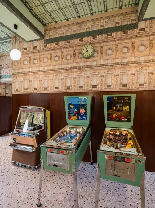 La Galleria Vittorio Emanuele, uno de los edificios más emblemáticos de Milán, es la inspiración para los techos arqueados y la mitad superior de la decoración de la pared del bar. Esta miniatura del techo de vidrio abovedado muestra la atención intrínseca al detalle que Anderson ha demostrado a lo largo de su carrera hasta la fecha.